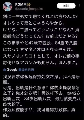 这条推发出十几分钟后,一位昵称“RGMM👯♀️”(@usada_konpeko)的用户看到了这条曝光。根据这位用户的发帖记录,这位用户似乎一直是进藤天音的忠实粉丝。在看到曝光后,RGMM连续发布了数条评论,集中表达了其数年来支持进藤天音的过程,措辞声色俱厉。而在这其中,就包含一条被网友们称为“八岐大蛇定型文”的回复。
