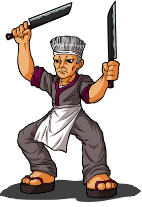 右手持菜刀的壮汉,皮肤黝黑,白色厨师帽和围裙,深色和服,深色木屐。