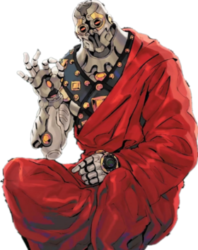 近未来的全身盔甲与西藏僧侣式的袍子,搭配起来有种不和谐感,整个人物也因此显得有些可疑。虽然一眼看上去像是改造人或者机器人,里面其实是有真人的,体型和关节等部位也和里面的人契合。因此,个子在参与者中显得尤为大。作为AB游戏参与者的标志,腕表被嵌在了盔甲的左手处。
