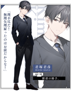 君冢君彦(日语:きみづか きみひこ)是由二语十所创作的轻小说《侦探已死》及其衍生作品的登场角色。