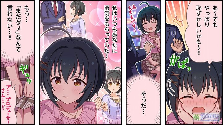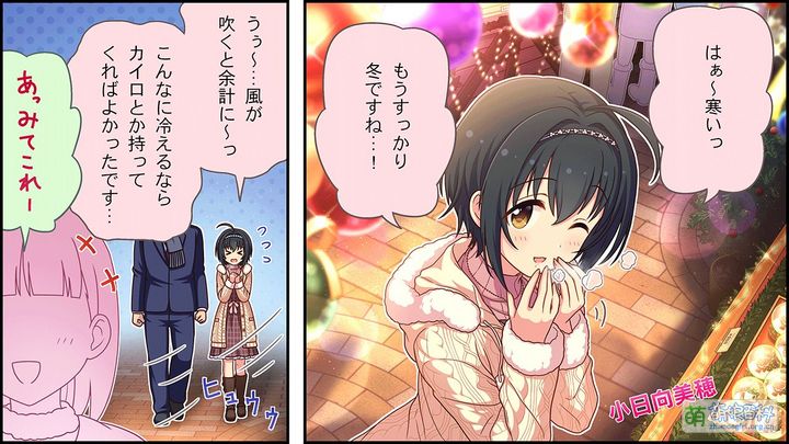 は、はじめまして!プ、ププ、プロデューサー!!こ、小日向美穂です。 す、すみませんちょっと緊張しちゃって…。 ファ、ファンに愛されるアイドル目指して、がっ、がっ、頑張ります! 初,初次见面!制,制制,制作人!!我,我是小日向美穗。 对,对不起,我有点紧张… 为,为了成为粉丝喜爱的偶像,我,我,我会加油的! | |||