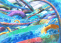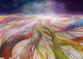 随后树海结界展开,天穹撕裂、如釉彩般的流光伴随着飞舞的花瓣从“墙壁”外流入世界,形成了树海世界。