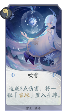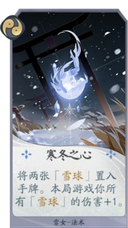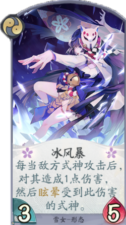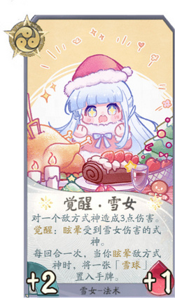 雪女能通过多种手段造成敌方式神眩晕,且眩晕后可获得雪球,此特性大大提升了雪女的续航能力,也为后期稳定地眩晕敌方式神提供保障,是一个强力的控制型式神。 雪女的主要卡牌为法术牌,觉醒后的雪女能在造成伤害后眩晕式神,此时的雪女有极强的控制能力。