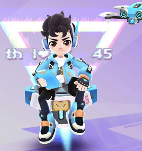 在游戏中表现为戴著一副头戴式耳机,穿著蓝色上衣和黑色短裤,戴著露指手套的少年形象。
