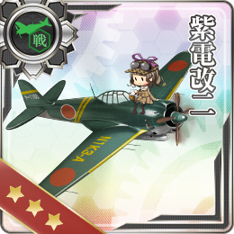 通常在中后期使用的舰上战斗机,开发即可获得,但对空(9)不如同为开发的烈风(10),在舰载机熟练系统实装前,在舰上战斗机中属于中等水平。然而随着熟练度系统实装,以及2015年10月30日更新后田中为紫电改二增加的三点回避,紫电可以说至少和烈风难分伯仲了。不知道欧提们今后在紫电改二和烈风的选择中会不会出现撕逼的情况。什么,你说你两个都没有?继续用零战对付吧……非提:蛐蛐战斗机为什么加回避!