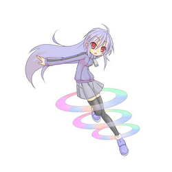 长长的银发,有一根呆毛,深红色的瞳孔,上半身穿着浅紫色的长袖运动服,运动服的两边分别有着一条粗黑线,领口很高而且前面有一个大号的拉链头,下半身穿着灰色的短裙,过膝黑丝,脚上穿着看上去很硬的靴子