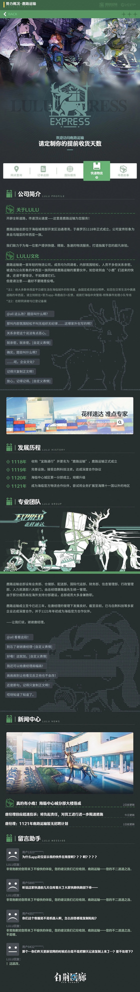 鹿路运输是一家年轻的物流公司,成员均为同调者,内部氛围轻松,人员不多但关系亲密。被选为公众形象的辛西亚一族同样是鹿路运输的重要伙伴,如您收到由“小鹿”们送来的快递,还请不要惊讶,不如摸摸它们。