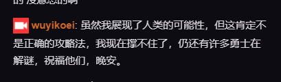 | 虽然我展现了人类的可能性,但这肯定不是正确的攻略法,我现在撑不住了,仍还有很多勇士在解密,祝福他们,晚安。 |